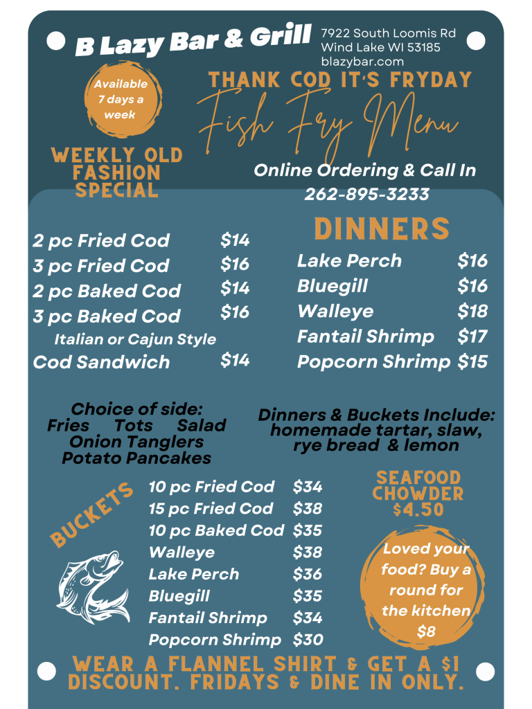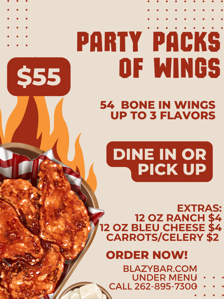 Wing prices on the menu are DINE IN ONLY. Wings to go add $2.50 per order of 6 wings. Online ordering not available for wings. Call in order only 262-895-7300.